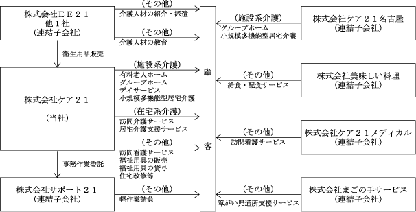 当社グループは、当社、連結子会社(株式会社サポート21、株式会社EE21及びその子会社1社、株式会社ケア21名古屋、株式会社美味しい料理、株式会社ケア21メディカル、並びに株式会社まごの手サービス)及び関連会社1社の計9社で構成されております。