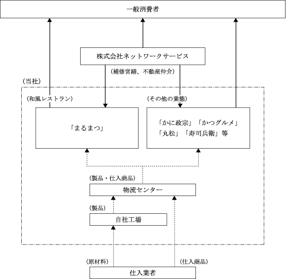 当社グループは、「もっと美味しく、もっと楽しく、もっと便利に」をモットーに、和食、そば、寿司等を提供する和風ファミリーレストラン「まるまつ」を中心とした店舗展開を行っております。「まるまつ」以外の業態としては、かに料理「かに政宗」、とんかつ「かつグルメ」、日本そば「丸松」、回転すし「寿司兵衛」等の店舗経営を行っております。