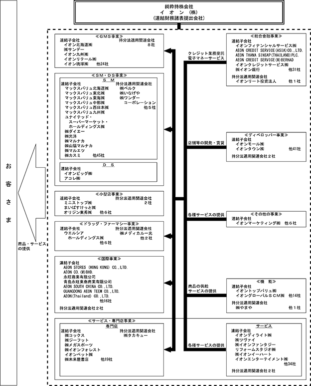 イオン北海道㈱、イオン九州㈱、㈱サンデー、ユナイテッド・スーパーマーケット・ホールディングス㈱、マックスバリュ北海道㈱、マックスバリュ東北㈱、マックスバリュ東海㈱、マックスバリュ中部㈱、マックスバリュ西日本㈱、マックスバリュ九州㈱、オリジン東秀㈱、ミニストップ㈱、イオンフィナンシャルサービス㈱、イオンモール㈱、㈱ツヴァイ、㈱イオンファンタジー、イオンディライト㈱、㈱コックス、㈱ジーフット、ウエルシアホールディングス㈱