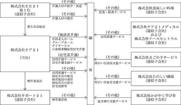当社グループは、当社、連結子会社(株式会社サポート21、株式会社EE21及びその子会社1社、株式会社美味しい料理、株式会社ケア21メディカル、株式会社まごの手サービス、株式会社たのしい職場、株式会社かがやく学び舎、並びに株式会社ナースセントラル)及び関連会社1社の計11社で構成されております。