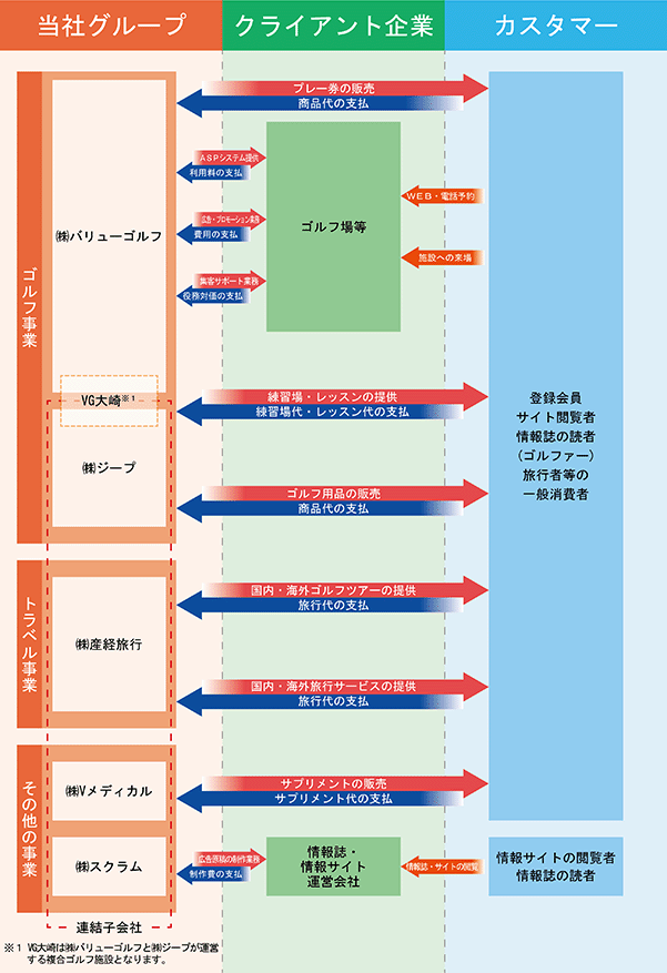 当社グループ(当社及び当社の関係会社)は、当社(株式会社バリューゴルフ)と子会社4社により構成されており、ゴルフ事業・トラベル事業・その他の事業(広告メディア制作事業・メディカル事業)を主たる業務としております。