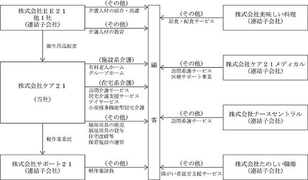 当社グループは、当社、連結子会社(株式会社サポート21、株式会社EE21及びその子会社1社、株式会社美味しい料理、株式会社ケア21メディカル、株式会社たのしい職場、株式会社ナースセントラル、並びにその他子会社5社)及び関連会社2社の計15社で構成されております。