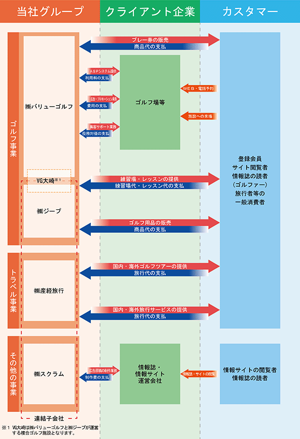 当社グループ(当社及び当社の関係会社)は、当社(株式会社バリューゴルフ)と子会社4社により構成されており、ゴルフ事業・トラベル事業・その他の事業(広告メディア制作事業)を主たる業務としております。