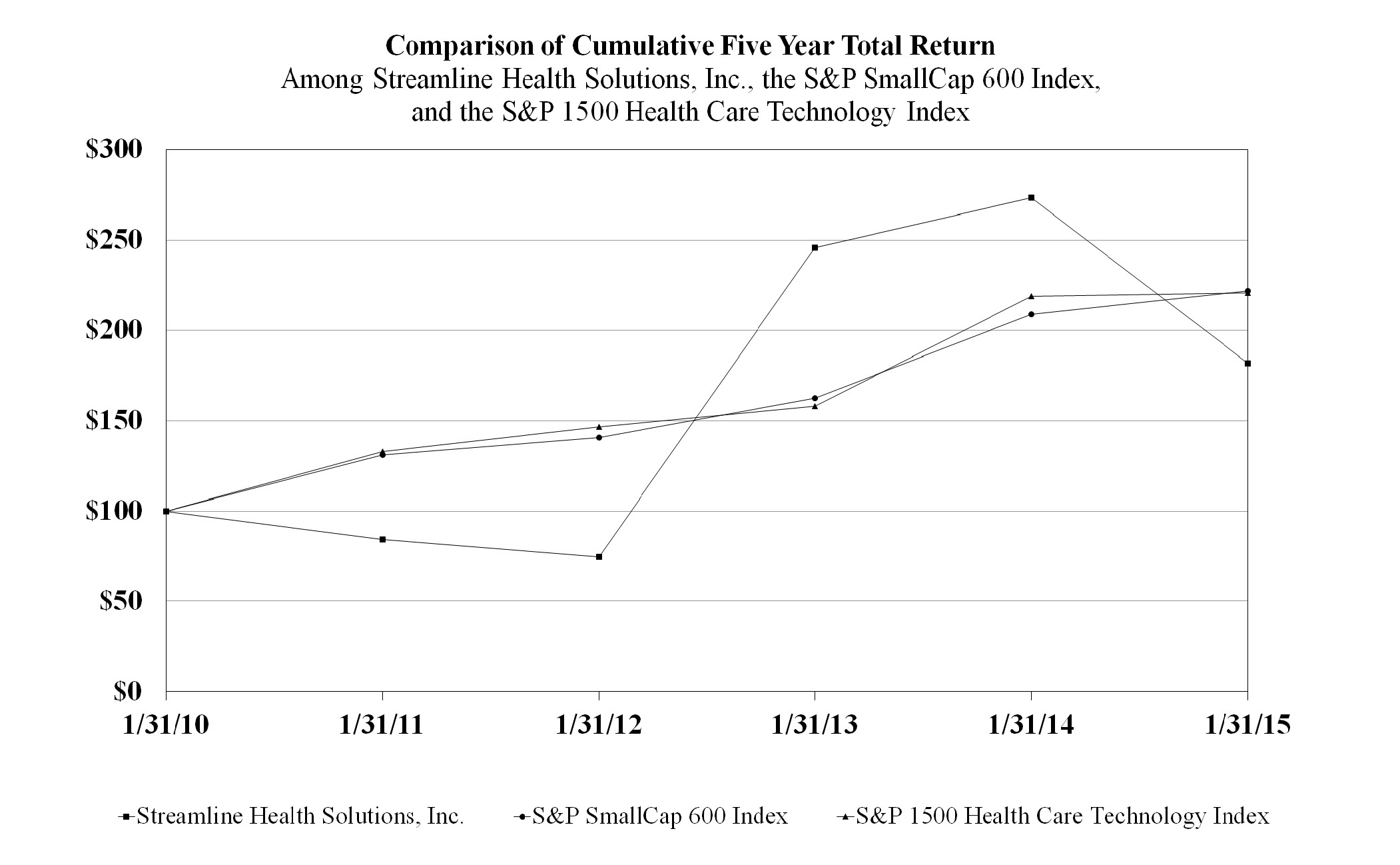 The following financial information from Streamline Health Solutions, Inc.'s Annual Report on Form 10- K for the fiscal year ended January 31, 2015 filed with the SEC on April 16, 2015, formatted in XBRL includes: (i) Consolidated Balance Sheets at January 31, 2015 and 2014, (ii) Consolidated Statements of Operations for the three years ended January 31, 2015, (iii) Consolidated Statements of Changes in Stockholders' Equity for the three years ended January 31, 2015, (iv) Consolidated Statements of Cash Flows for the three years ended January 31, 2015, and (v) the Notes to Consolidated Financial Statements.