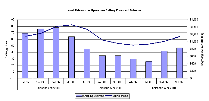 Net sales for the segment increased by $21.0 million, or 64%, in the third quarter 2010 compared to the third quarter of 2009, and $11.7 million, or 28%, on a linked-quarter basis. Both volumes and pricing increased in the third quarter 2010, with our average steel fabrication operations’ selling price per ton shipped increasing $187, or 20%, during the third quarter of 2010 when compared with the same period in 2009, and increasing $131, or 13%, on a linked-quarter basis. Net sales for the segment decreased $10.6 million to $120.2 million for the first nine months of 2010 as compared to the first nine months of 2009. Our average steel fabrication operations’ selling price per ton shipped decreased $89, or 8%, in the first nine months of 2010 as compared to the same period in 2009.