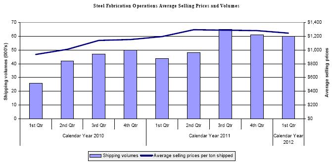 Net sales for the segment increased by $22.2 million, or 42%, in the first quarter of 2012 compared to the first quarter of 2011, as both pricing and volumes increased in the first quarter of 2012 when compared with the same period in 2011. Our average steel fabrication operations’ selling price per ton shipped increased $49, or 4%, during the first quarter of 2012 versus the same period in 2011. Sales volumes increased 16,000 tons, or 37%, to 60,000 tons in the first quarter of 2012 compared to the first quarter of 2011, with some of this increase coming from market share gains in existing markets, and some related to our expansion into the western United States from the start-up of plants in Arkansas, Nevada and Northern Mexico. We also anticipate continuing to expand our market presence and penetration in the western portion of the United States as we ramp up our operations in that market.