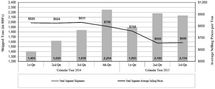 Net sales for the steel fabrication segment operations decreased $15.1 million, or 8%, in the third quarter of 2015, compared to the third quarter of 2014. Shipments decreased 10% while average selling prices increased 3% in the third quarter of 2015, as compared to the same period in 2014. While there continues to be a positive trend in the non-residential construction market, and order entry remains strong, our sales volumes in the third quarter 2015 were below those of the same 2014 period as we were able to maintain relatively stable selling prices. Net sales for the segment increased $49.8 million, or 11%, in the first nine months of 2015, compared to the first nine months of 2014, as volumes increased 2% and selling prices increased 9%. Our steel fabrication operations continue to realize strength in order activity and resulting shipments and selling prices, as we leverage our national operating footprint and market demand continues to improve.