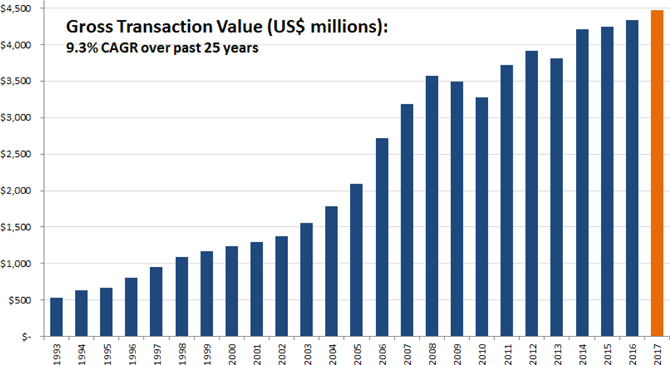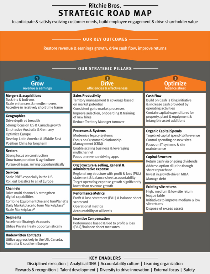 Ritchie Bros. Auctioneers Incorporated (“Ritchie Bros.”, the “Company”, “we”, or “us”) (NYSE & TSX: RBA) is a world leader in asset management and disposition of used industrial equipment and other durable assets, selling $4.5 billion of used equipment and other assets during 2017. Our expertise, unprecedented global reach, market insight, and trusted portfolio of brands provide us with a unique position in the used equipment market. We primarily sell used equipment for our customers through live, unreserved auctions at 45 auction sites worldwide, which are simulcast online to reach a global bidding audience. On May 31, 2017, we acquired IronPlanet Holdings, Inc. (“IronPlanet”) for $776.5 million, a leading online marketplace for heavy equipment and other durable assets. Between its inception in 1999 and 2016, IronPlanet sold over $5 billion of used heavy equipment online and registered more than 1.5 million users worldwide. These complementary used equipment brand solutions, together with Marketplacee, our online marketplace that supports reserved pricing, provide different value propositions to equipment owners and allow us to meet the needs and preferences of a wide spectrum of equipment sellers and buyers. In the past three years, we have also added a private brokerage service (Ritchie Bros. Private Treaty) and an online listing service (Mascus).