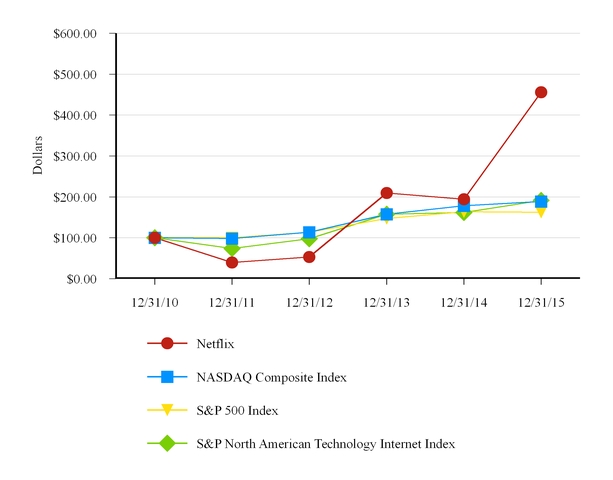 The following financial information from Netflix, Inc.’s Annual Report on Form 10-K for the year ended December 31, 2015 filed with the SEC on January 28, 2016, formatted in XBRL includes: (i) Consolidated Statements of Operations for the Years Ended December 31, 2015, 2014 and 2013, (ii) Consolidated Statements of Comprehensive Income for the Years Ended December 31, 2015, 2014 and 2013, (iii) Consolidated Statements of Cash Flows for the Years Ended December 31, 2015, 2014 and 2013, (iv) Consolidated Balance Sheets as of December 31, 2015 and 2014, (v) Consolidated Statements of Stockholders' Equity for the Years Ended December 31, 2015, 2014 and 2013 and (vi) the Notes to Consolidated Financial Statements.