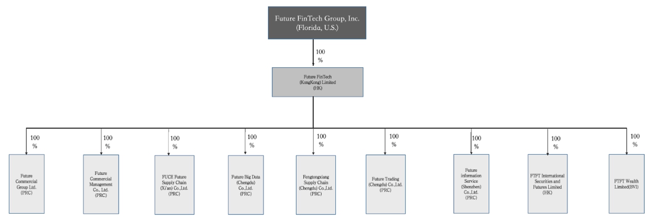 Future FinTech is a holding company incorporated under the laws of the State of Florida. The Company historically engaged in the production and sale of fruit juice concentrates (including fruit purees and fruit juices), fruit beverages (including fruit juice beverages and fruit cider beverages) in the PRC. Due to drastically increased production costs and tightened environmental laws in China, the Company had transformed its business from fruit juice manufacturing and distribution to financial technology related service businesses. The main business of the Company included supply chain financing services and trading in China, asset management business in Hong Kong and cross-border money transfer service in UK. The Company also expanded into brokerage and investment banking business in Hong Kong and cryptocurrency mining farm in the U.S. The Company had a contractual arrangements with a VIE E-Commerce Tianjin in China, which has generated minimal revenue and business since 2021 due to the negative impact caused by COVID-19. The Company started the process to close it down in November 2023 and completed deregistration and dissolution of the VIE with local authority on March 7, 2024. Due to worsened investment market sentiment in Hong Kong, the Company sold its ownership in Nice Talent Asset Management Limited (“NTAM”) to a third party for HK$2.4 million (approximately $300,000) in November 2024 and is no longer in asset management business in Hong Kong. On December 6, 2024, the Company agreed to sell all issued and outstanding shares of FTFT SuperComputing Inc. a wholly owned subsidiary of the Company (“FTFT SuperComputing”) to DDMM Capital LLC (the “Buyer”) for a purchase price that equals to: (i) the assumption of the obligations of FTFT SuperComputing totaling $973,072.24 and (ii)$1,000,000, which was paid to an account at Olshan Frome Wolosky LLP to satisfy, in part, the right of payment held by FT Global Capital, Inc. arising from the judgment entered in favor of FT Global and against the Company registered in the Southern District of New York and all matters pertaining to such litigation. The closing of the transactions contemplated by the Agreement took place on December 9, 2024. On December 18, 2024, the Company sold all of its interest and ownership of Future Fintech Digital Capital Management LLC, FTFT UK Limited, DigiPay FinTech Limited, GlobalKey SharedMall Limited, Future Fintech Labs Inc., and Future Fintech Digital Number One GP, LLC (USA) to Alec Orudjiev, the general counsel of FT Global for $25,000 through the court ordered auction by the United States Marshal for the Southern District of New York. Currently, the main business of the Company is supply-chain financing services and trading in China.