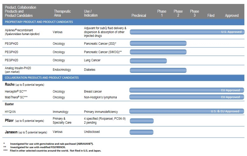 Our proprietary development pipeline consists primarily of clinical stage product candidates in oncology and diabetes. Our lead oncology program is PEGPH20 (PEGylated recombinant human hyaluronidase), a new molecular entity, under development for the systemic treatment of tumors that accumulate HA. When HA accumulates in a tumor, it can cause higher pressure in the tumor, reducing blood flow into the tumor and with that, reduced access of cancer therapies to the tumor. PEGPH20 works by temporarily degrading HA surrounding some cancer cells and results in reduced pressure and increased blood flow to the cancer with increased amounts of anticancer treatments administered concomitantly gaining access to the tumor. We are currently in Phase 2 clinical testing for PEGPH20 in metastatic pancreatic cancer (Study 109-202), and we have recently initiated a clinical trial in non-small cell lung cancer (Study 107-201). We have also been investigating Hylenex recombinant for use as pre-treatment in patients with Type 1 diabetes using pumps.