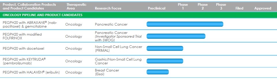 Our proprietary development pipeline consists primarily of clinical stage product candidates in oncology. Our lead oncology program is PEGPH20 (PEGylated recombinant human hyaluronidase), a molecular entity we are developing for the systemic treatment of tumors that accumulate HA. When HA accumulates in a tumor, it can cause higher pressure in the tumor, reducing blood flow into the tumor and with that, reduced access of cancer therapies to the tumor. PEGPH20 works by temporarily degrading HA surrounding cancer cells resulting in reduced pressure and increased blood flow to the tumor thereby enabling increased amounts of anticancer treatments administered concomitantly gaining access to the tumor. We are currently in Phase 2 and Phase 3 clinical testing for PEGPH20 in stage IV pancreatic ductal adenocarcinoma (PDA) (Studies 109-202 and 109-301), in Phase 1b clinical testing in non-small cell lung cancer (Study 107-201) and in Phase 1b clinical testing in non-small cell lung cancer and gastric cancer (Study 107-101).