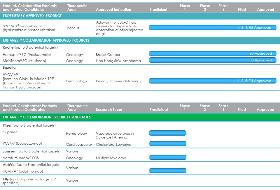 Our proprietary enzymes are used to facilitate the delivery of injected drugs and fluids, potentially enhancing the efficacy and the convenience of other drugs or can be used to alter tissue structures for potential clinical benefit. We exploit our technology and expertise using a two pillar strategy that we believe enables us to manage risk and cost by: (1) developing our own proprietary products in therapeutic areas with significant unmet medical needs, with a focus on oncology, and (2) licensing our technology to biopharmaceutical companies to collaboratively develop products that combine our technology with the collaborators’ proprietary compounds.