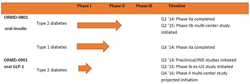 In September 2013, we submitted a pre-IND, package to the FDA, for ORMD-0901, our oral exenatide capsule, for a Phase 2 clinical trial on healthy volunteers and type 2 diabetic patients.  We began pre-clinical studies in November 2014 and expect to begin IND-enabling studies in the second quarter of calendar year 2016. We then intend to file an IND and move immediately and directly into a large Phase II multi-center trial in the United States. In August 2015, we began a non-FDA approved clinical trial on type 2 diabetic patients, and we anticipate it will be completed during the first quarter of calendar year 2016.