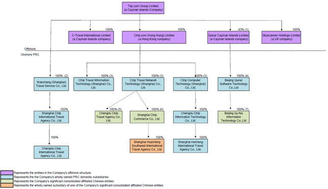 | • | “we,” “us,” “our company” or “Trip.com Group” refers to Trip.com Group Limited (formerly known as Ctrip.com International, Ltd.), its predecessor entities and subsidiaries, and, in the context of describing our operations and consolidated financial information, its consolidated affiliated Chinese entities, unless otherwise indicated herein. We consolidate the financial results of Qunar starting from December 31, 2015. In calculating the number of hotels with which we have room supply relationships, downloads of and transactions through our mobile channel, and other operational data, where applicable, as well as in describing our marketing, branding, and intellectual properties, we have not taken into account the comparable operating data or other information of Qunar. |