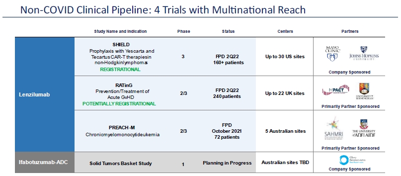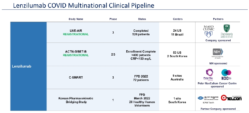 We completed a Phase 3 potentially registrational trial with lenzilumab in newly hospitalized COVID-19 patients and announced positive topline data from the study known as “LIVE-AIR” in March 2021. On September 8, 2021, FDA informed us that it had declined to issue an EUA for lenzilumab in this indication. FDA has advised us that they will review an amended EUA submission with further data. MHRA raised certain questions in its review of our application for marketing authorization to which we are drafting responses. A further step in our development program for lenzilumab in COVID-19 is the release of results from the Accelerating COVID-19 Therapeutic Interventions and Vaccines-5 (“ACTIV-5”) and Big Effect Trial, in the “B” arm of the trial (“BET-B”), referred to as the ACTIV-5/BET-B trial, which is sponsored and funded by the National Institutes of Health (“NIH”). A subgroup analysis of the LIVE-AIR study suggested that patients under the age of 85 and with a baseline CRP below 150 mg/L (the “CRP subgroup”) appeared to derive the greatest benefit from lenzilumab. As a result, NIH amended the ACTIV-5/BET-B study protocol to include baseline CRP below 150 mg/L as the primary analysis population and submitted the amendment to FDA. The ACTIV-5/BET-B study has completed enrollment. Analysis of data by the NIH can begin once the database lock has occurred. The NIH controls the data analysis and we may be unable to influence the timeline for completion. It is possible, but not assured, that the results from the ACTIV-5/BET-B trial may support the preparation of an amended submission for an EUA, as well as our response to MHRA. If the results from ACTIV-5/BET-B are not positive, we may consider utilizing data from other on-going COVID-19 studies, conduct a further and new clinical trial, seek a partner to develop lenzilumab in this indication or abandon this development program altogether. Unfavorable results likely would have a material and adverse impact on our stock price and ability to obtain future financing needed to continue as a going concern.