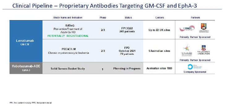 As further described in Part I, Item 2— Management’s Discussion and Analysis of Financial Condition and Results of Operations, primary elements of our strategic realignment plan include accelerating the development of lenzilumab in CMML, a rare blood cancer, for which the PREACH-M study is already underway, and to continue our plans for the RATinG study in aGvHD that occurs in patients undergoing bone marrow transplant. We also intend to assess and support further clinical assessment of lenzilumab for prevention of CAR-T therapy related toxicities through an investigator-initiated trial. We will need to successfully enroll and complete clinical trials of lenzilumab for CMML, aGvHD, CAR-T therapy and other non-COVID-19 related indications, and of ifabotuzumab, and potentially obtain regulatory approval to market these products. With respect to the ongoing PREACH-M study of lenzilumab for the treatment of high-risk CMML, there can be no assurance that additional patients will be enrolled in the PREACH-M study, that the interim results will be favorable or that regulatory authorities will agree that a modified trial design will be sufficient for registration and approval.