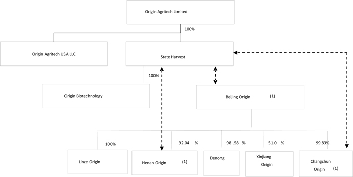 ·“we,” “us,” “our company,” “our,” the “Company” and “Origin” refer to Origin Agritech Limited and, in the context of describing our operations, also includes State Harvest Holdings Limited and the following, which are collectively described in this Annual Report as “our PRC Operating Companies”: Beijing Origin State Harvest Biotechnology Limited, or Origin Biotechnology, Beijing Origin Seed Limited, or Beijing Origin, and its five subsidiaries, Changchun Origin Seed Technology Development Limited, or Changchun Origin, Henan Origin Cotton Technology Development Limited, or Henan Origin, Denong Zhengcheng Seed Limited, or Denong, Linze Origin Seed Limited, or Linze Origin, Xinjiang Originbo Seed Limited, or Xinjiang Origin.