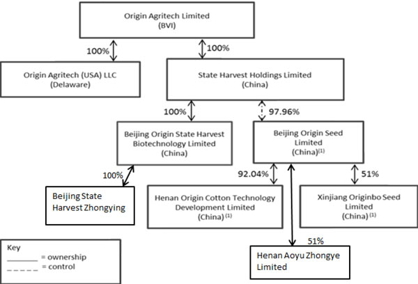 “we,” “us,” “our company,” “our,” the “Company” and “Origin” refer to Origin Agritech Limited, State Harvest Holdings Limited and the following, which are collectively described in this Annual Report as “our PRC Operating Companies”: Beijing Origin State Harvest Biotechnology Limited, or Origin Biotechnology, Beijing Origin Seed Limited, or Beijing Origin, and its four subsidiaries, (i) Henan Origin Cotton Technology Development Limited, or Henan Origin, (ii) Xinjiang Originbo Seed Limited, or Xinjiang Origin, (iii) Origin Agritech USA, LLC or Origin USA and (iv) Beijing State Harvest Zhongying Network Technology Limited or Zhongying, and five newly established joint ventures: Hubei Aoyu Agricultural Technology Limited (“Hubei Aoyu”), Anhui Aoyu Zhongye Technology Ltd. (“Anhui Aoyu”) in Anhui province, Xuzhou Aoyu Agricultural Technology Ltd. (“Xuzhou Aoyu”) in Jiangsu province, Shandong Aoyu Zhongye Limited (Shandong Aoyu) in Shandong province and Henan Aoyu Zhongye Limited (Henan Aoyu) in Henan province.