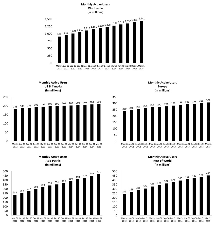 Some of our metrics have also been affected by applications on certain mobile devices that automatically contact our servers for regular updates with no user action involved, and this activity can cause our system to count the user associated with such a device as an active user on the day such contact occurs. The impact of this automatic activity on our metrics varies by geography because mobile usage varies in different regions of the world. In addition, our data regarding the geographic location of our users is estimated based on a number of factors, such as the user's IP address and self-disclosed location. These factors may not always accurately reflect the user's actual location. For example, a mobile-only user may appear to be accessing Facebook from the location of the proxy server that the user connects to rather than from the user's actual location. The methodologies used to measure user metrics may also be susceptible to algorithm or other technical errors. Our estimates for revenue by user location and revenue by user device are also affected by these factors. We regularly review our processes for calculating these metrics, and from time to time we may discover inaccuracies in our metrics or make adjustments to improve their accuracy, including adjustments that may result in the recalculation of our historical metrics. We believe that any such inaccuracies or adjustments are immaterial unless otherwise stated. In addition, our DAU and MAU estimates will differ from estimates published by third parties due to differences in methodology. For example, some third parties are not able to accurately measure mobile users or do not count mobile users for certain user groups or at all in their analyses.