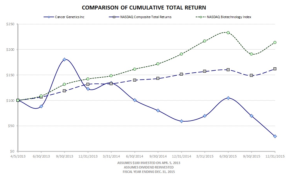 The following financial statements from this annual report on Form 10-K of Cancer Genetics, Inc. for the year-ended December 31, 2015, filed on March 10, 2016, formatted in XBRL (eXtensible Business Reporting Language): (i) the Consolidated Balance Sheets, (ii) the Consolidated Statements of Income, (iii) the Consolidated Statements of Cash, (iv) the Consolidated Statements of Stockholders' Equity and (v) the Notes to the Consolidated Financial Statements.