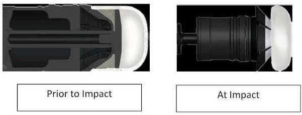 In order to ensure that the projectile did not injure the targeted individual, SDI needed to develop a way to cushion the impact of the round upon contact with the target. The solution was a collapsible head that compressed upon impact. (See below). When it became clear that SDI did not have sufficient funds to complete development of the WEP, it was decided to use the collapsible head design to create an impact round. The hope was that with this new, state-of-the-art impact round, SDI could generate enough profitability that it would be able to complete development of the WEP.