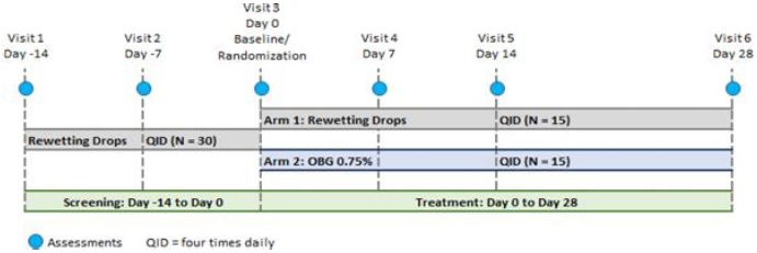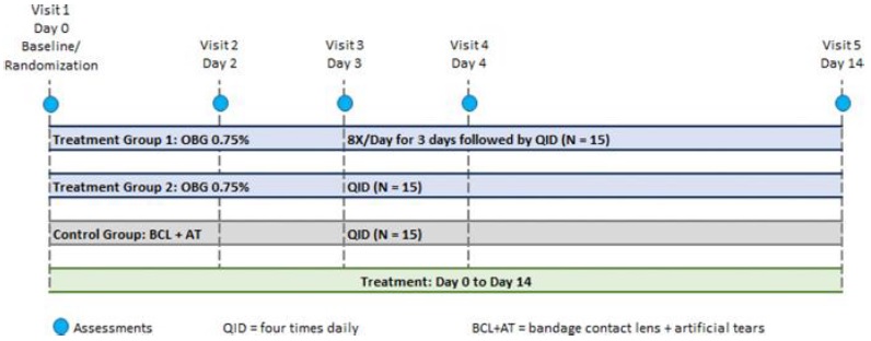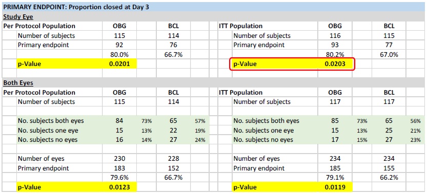 EyeGate OBG has been shown to provide a mechanical barrier that aids in the management of corneal epithelial defects and re-epithelization in both preclinical studies and in clinical ophthalmic veterinary use. As such, PRK surgery was chosen as the subject population which is best suited to demonstrate this effect. PRK is an efficacious alternative to patients seeking surgical correction of refractive errors who are not suitable candidates for laser in situ keratomileusis (“LASIK”) due to inadequate corneal thickness, larger pupil size, history of keratoconjunctivitis sicca (“KCS”), or anterior basement membrane disease.
