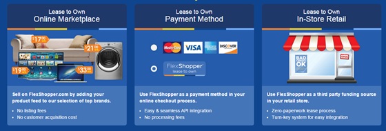 FlexShopper launched its online LTO Marketplace in March 2014 and FlexShopper launched its LTO payment method in December 2014. Retailers and e-tailers that sell furniture, electronics, computers, appliances and other durable goods and partner with FlexShopper, will have three channels to increase their sales: in the store, online and on our marketplace. FlexShopper will enable merchants to sell to more than 50 million consumers that do not have sufficient credit or cash to buy from them. In addition, FlexShopper pays the merchant 100% pf the retail price. Our offerings to retail merchants are as follows as depicted in our marketing literature: