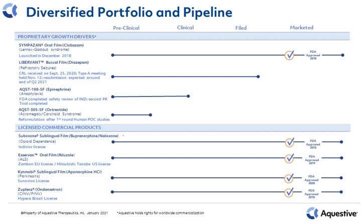 These forward-looking statements include, but are not limited to, statements regarding the advancement and related timing of Libervant and AQST-108-SF through the regulatory and development pipeline; the focus on growing the Company’s commercial sales of Sympazan® and continuing to manufacture Suboxone® and other licensed products; the ability to address the concerns identified in the FDA’s Complete Response Letter dated September 25, 2020 regarding the New Drug Application for Libervant and obtain FDA approval of Libervant for U.S. market access; clinical trial timing and plans for AQST-108-SF; the 2021 financial outlook; and business strategies, market opportunities, and other statements that are not historical facts.  These forward-looking statements are also subject to the uncertain impact of the COVID-19 global pandemic on our business including with respect to our clinical trials including site initiation, patient enrollment and timing and adequacy of clinical trials; on regulatory submissions and regulatory reviews and approvals of our product candidates; pharmaceutical ingredients and other raw materials supply chain, manufacture and distribution; sale of and demand for our products; our liquidity and availability of capital resources, customer demand for our products and services; customers’ ability to pay for goods and services; and ongoing availability of an appropriate labor force and skilled professionals.  Given these uncertainties the Company is unable to provide assurance that operations can be maintained as planned prior to the COVID-19 pandemic.