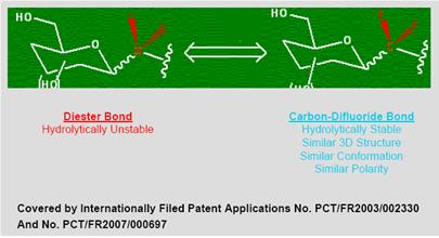 Many therapeutically important compounds contain diester bonds that link different parts of the molecule together.  Diester bonds are naturally unstable often leading to suboptimal performance when the molecule is administered to patients.  Diester bonds have specific three-dimensional structure, as well as electrostatic properties that cannot be easily mimicked by other bonds.  Bonds that do not mimic the diester bond correctly invariably render the compound inactive.  In collaboration with Institut National des Sciences Appliquées de Rouen in France (“INSA”), Advanomics has developed a way to replace the diester bond with a Carbon-Difluoride bond which acts as a diester isostere.  An isostere is a different chemical structure that mimics the properties of the original.  In the body, Carbon-Difluoride compounds are resistant to metabolic degradation but recognized similarly to the diester compounds (See Figure 1).