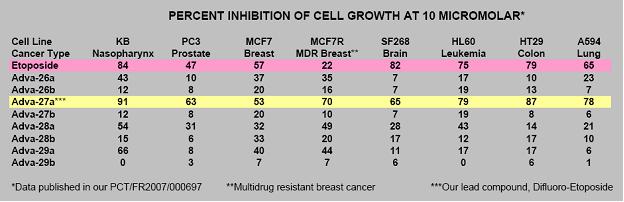 Although Adva-27a is a derivative of Etoposide, it is in fact a new chemical entity and has displayed markedly different activity in various laboratory tests.  For example, in addition to enhanced cytotoxicity (Table 1), Adva-27a has shown unique pharmaceutical properties of substantial interest.  Our preclinical studies to date have shown that: