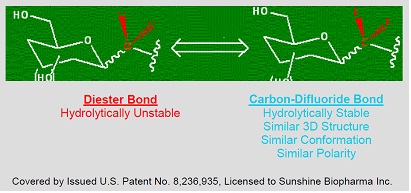 Many therapeutically important compounds contain diester bonds that link different parts of the molecule together. Diester bonds are naturally unstable often leading to suboptimal performance when the molecule is administered to patients. Diester bonds have specific three-dimensional, as well as electrostatic properties that cannot be easily mimicked by other bonds. Chemical bonds that do not mimic the diester bond correctly invariably render the compound inactive. In collaboration with Institut National des Sciences Appliquées de Rouen in France (“INSA”), Advanomics Corporation has developed a way to replace the diester bond with a Carbon-Difluoride bond which acts as a diester isostere. An isostere is a different chemical structure that mimics the properties of the original. In the body, Carbon-Difluoride compounds are resistant to metabolic degradation but recognized similarly to the diester compounds (see Figure 1).