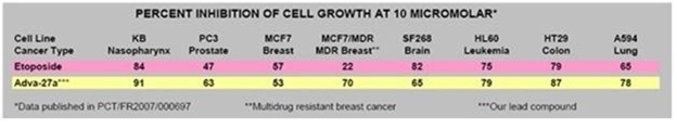 Our initial drug candidate is Adva-27a, a GEM-difluorinated C-glycoside derivative of Podophyllotoxin, targeted for various forms of cancer.  If we are successful in our current financing efforts, Adva-27a is expected to enter Phase I clinical trials for pancreatic cancer and multidrug resistant breast cancer in mid to late 2017.  See “Clinical Development Path” and “Clinical Trials” below.  Etoposide, which is also a derivative of Podophyllotoxin, is currently on the market and is used to treat various types of cancer including leukemia, lymphoma, testicular cancer, lung cancer, brain cancer, prostate cancer, bladder cancer, colon cancer, ovarian cancer, liver cancer and several other forms of cancer.  Like Etoposide, Adva-27a is a Topoisomerase II inhibitor; however, unlike Etoposide and other anti-tumor drugs currently in use, Adva-27a is able to destroy multidrug resistant cancer cells.  Adva-27a is a new chemical entity and has been shown to have distinct and more desirable biological properties compared to Etoposide.  Most notably, Adva-27a is very effective against multidrug resistant breast cancer cells while Etoposide has no activity against this aggressive form of cancer (see Figure 1).  In other side-by-side studies against Etoposide as a reference, Adva-27a showed markedly improved cell killing activity in various other cancer types, particularly prostate, colon and lung cancer (see Table 1).  Our preclinical studies to date have shown that: