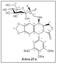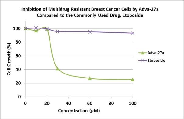 Adva-27a is a GEM-difluorinated C-glycoside derivative of Podophyllotoxin (see Figure 1). Another derivative of Podophyllotoxin called Etoposide is currently on the market and is used to treat various types of cancer including leukemia, lymphoma, testicular cancer, lung cancer, brain cancer, prostate cancer, bladder cancer, colon cancer, ovarian cancer, liver cancer and several other forms of cancer. Etoposide is one of the most widely used anticancer drugs. Adva-27a and Etoposide are similar in that they both attack the same target in cancer cells, namely the DNA unwinding enzyme, Topoisomerase II. Unlike Etoposide however, Adva-27a is able to penetrate and destroy Multidrug Resistant Cancer cells. Adva-27a is the only compound known today that is capable of destroying Multidrug Resistant Cancer. In addition, Adva-27a has been shown to have distinct and more desirable biological and pharmacological properties compared to Etoposide. In side-by-side studies using Multidrug Resistant Breast Cancer cells and Etoposide as a reference, Adva-27a showed markedly greater cell killing activity (see Figure 2).