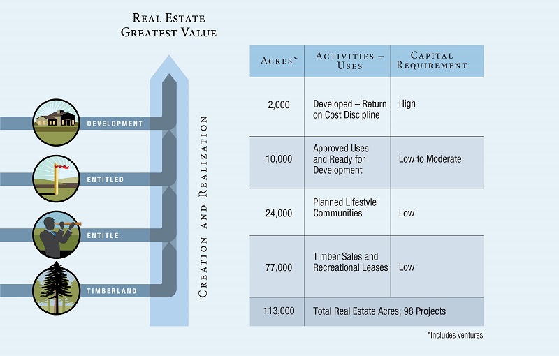 We realize value from our undeveloped land by selling fiber and by managing it for future real estate development and conservation uses. We also generate cash flow and earnings through recreational leases. We are focused on creating value from our water interests by securing reservation and production supply agreements with various municipalities and water providers in our target markets.