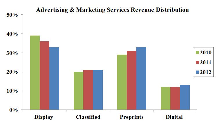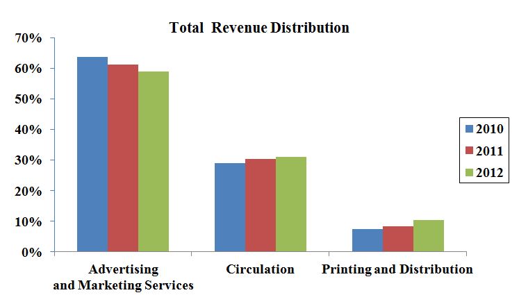 The Company’s primary revenue is from advertising sold in published issues of its newspapers and on the Company’s websites, the sale of newspapers to subscribers and single copy customers, and commercial printing and distribution. The following sets forth the Company’s distribution of revenue in 2012, 2011 and 2010 by type: