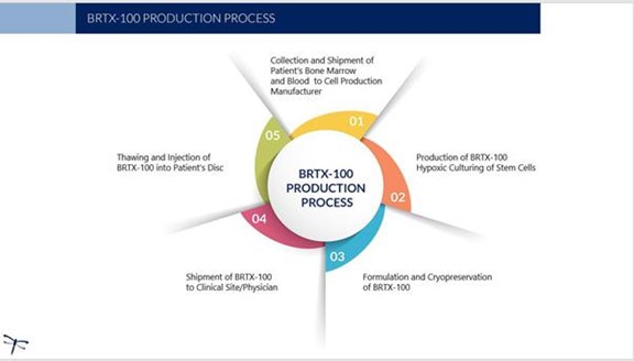 | ● | Disc/Spine Program (brtxDisc). Our lead cell therapy candidate, BRTX-100, is a product formulated from autologous (or a person’s own) cultured mesenchymal stem cells, or MSCs, collected from the patient’s bone marrow. We intend that the product will be used for the non-surgical treatment of painful lumbosacral disc disorders or as a complimentary therapeutic to a surgical procedure. The BRTX-100 production process utilizes proprietary technology and involves collecting a patient’s bone marrow, isolating and culturing stem cells from the bone marrow and cryopreserving the cells. In an outpatient procedure, BRTX-100 is to be injected by a physician into the patient’s damaged disc. The treatment is intended for patients whose pain has not been alleviated by non-surgical procedures and who potentially face the prospect of surgery. We have received authorization from the FDA to commence a Phase 2 clinical trial using BRTX-100 to treat chronic lower back pain arising from degenerative disc disease. We have commenced such clinical trial through the execution of a CRO agreement with PRC Clinical, the execution of clinical trial site agreements, patient enrollment, the commencement of patient procedures, the purchase of manufacturing equipment and the expansion of our laboratory to include capabilities for clinical production. In March 2022, a United States patent related to our Disc/Spine Program was issued. We have been granted exclusive license rights with regard to the patent. See “Disc/Spine Program” below. |