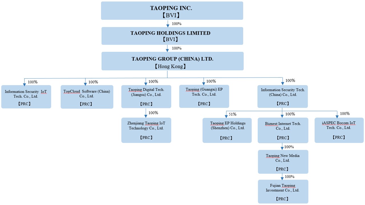 Taoping is not an operating company but rather a holding company incorporated in the BVI. Because Taoping has no business operations of its own, we conduct our business through Taoping’s operating subsidiaries, primarily in China. This structure involves unique risks to investors and you may never directly hold equity interests in Taoping’s operating entities. You are specifically cautioned that there are significant legal and operational risks associated with being based in or having the majority of operations in China, including that changes in the legal, political and economic policies of the Chinese government, the relations between China and the United States, or Chinese or United States regulations may materially and adversely affect our business, financial condition, results of operations and the market price of Taoping’s securities. Moreover, the Chinese government may exercise significant oversight and discretion over the conduct of our business and may intervene in or influence our operations at any time, which could result in a material change in our operations and/or the value of Taoping’s securities or could significantly limit or completely hinder our ability to offer or continue to offer Taoping securities to investors and cause the value of such securities to significantly decline or be worthless. For a detailed description of risks related to the holding corporate structure, see Item 3 “Key Information-D. Risk Factors-Risks Related to Doing Business in China”.