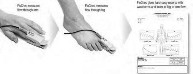 FloChec® features a sensor clamp that is placed on the toe or finger much like current pulse oximetry devices. Infrared light emitted from the clamp on the dorsal surface of the digit is scattered and reflected by the red blood cells coursing through the area of illumination. Returning light is ‘sensed’ by the sensor. A blood flow waveform is instantaneously constructed by our proprietary software algorithm and displayed on the video monitor. Both index fingers and both large toes are interrogated, which takes about 30 seconds for each. A hardcopy report form is generated that displays four waveforms and the ratio of each leg measurement compared with the arms. Results are classified as Flow Obstruction or No Flow Obstruction.