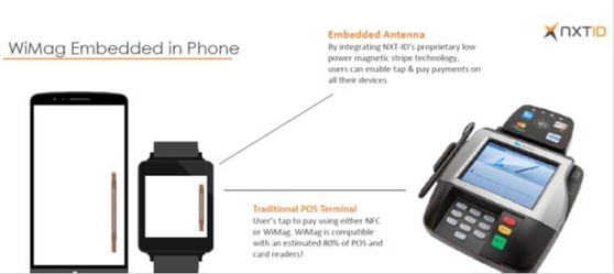 In the finance area, the technology pioneered in the Nxt-ID “Wocket” has continued to develop in both range of capability while shrinking in size. This provides a technology package that can be integrated into a “smart wallet” that has the same technology as Apple Pay or into a card that can be used for a variety of transactions including – magnetic stripe emulation (Wi-Mag), Near Field Communication (NFC), tokens, barcode/QR codes and there can also be an EMV chip and a Bluetooth Beacon for remote sensing and response applications. Versions of this technology package provide a functional and secure “vault” that allows for full consumer control and customization by OEMs and solution providers.