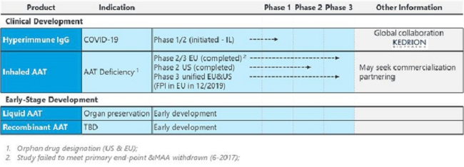 our plan to continue to develop our pipeline, primarily focusing on the pivotal Phase 3 InnovAATe clinical trial of Inhaled AAT for the treatment of Alpha-1 Antitrypsin Deficiency (“AATD”) and the development of our Anti-SARS-CoV-2 IgG product, and to explore new strategic business development opportunities.