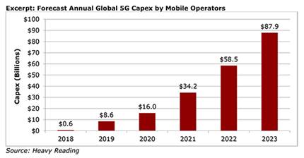 Unlike 4G LTE, which operates on established frequency bands below 6GHz, 5G requires frequencies up to 300GHz. Wireless carriers still need to bid for the costly higher spectrum bands, as they build and roll out their respective 5G networks. Adding the necessary hardware required for 5G networks can significantly increase operating expenses. Building 5G networks is expensive. According to Heavy Reading’s Mobile Operator 5G Capex, total global spending on 5G is set to reach $88 billion by 2023. 3