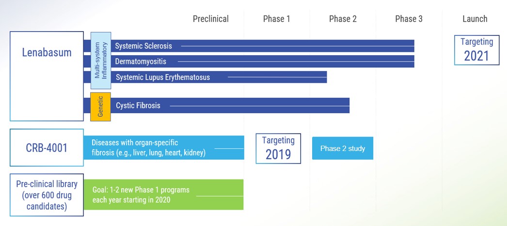 We are a Phase 3, clinical-stage pharmaceutical company focused on the development and commercialization of novel therapeutics to treat chronic and serious inflammatory and fibrotic diseases with clear unmet medical needs by targeting the human endocannabinoid system (ECS). We are developing a pipeline of cannabinoid drug candidates which are rationally designed, synthetic, small molecule drugs which target the ECS to treat inflammatory and fibrotic diseases. Our focus on the ECS is backed by an ever-expanding body of knowledge on the biology of the ECS and its role as being a master regulator of inflammation and fibrosis. Our lead investigational drug candidate, lenabasum, is a novel, synthetic, oral, cannabinoid (CB2 agonist) designed to resolve chronic inflammation and halt fibrotic processes. We are currently developing lenabasum to treat four serious and rare chronic inflammatory diseases: systemic sclerosis (SSc), dermatomyositis (DM), cystic fibrosis (CF) and systemic lupus erythematosus (SLE). In addition, we are developing a pipeline of experimental drug candidates from our library of more than 600 novel cannabinoids targeting the ECS. Our pipeline also includes CRB-4001, a 2nd generation, peripherally-restricted, CB1 inverse agonist designed to treat organ specific fibrotic liver diseases, such as nonalcoholic steatohepatitis (NASH). We expect to initiate a Phase 1 study for CRB-4001 by the end of 2019.