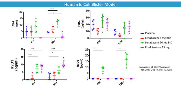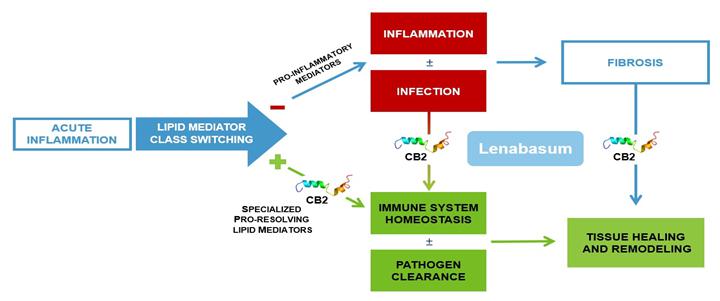 Lenabasum selectively binds to CB2 in the periphery, which is preferentially expressed on activated immune cells, fibroblasts and other cell types, including muscle and bone cells. Lenabasum stimulates the production of Specialized Pro-Resolving Lipid Mediators (SPMs) that act to resolve inflammation and halt fibrosis without immunosuppression by activating endogenous pathways. These pathways are activated in healthy individuals during the course of normal immune responses but are dysfunctional in patients with chronic inflammatory and fibrotic diseases. By its binding to CB2, lenabasum drives innate immune responses from the activation phase into the resolution phase. CB2 plays a central role in modulating and resolving inflammation by, in effect, turning heightened inflammation “off” and restoring homeostasis. This has been demonstrated in animal models lacking CB2 as well as humans with genetic polymorphism in the CB2 gene, as these exhibit excessive inflammation and fibrosis in response to activators of the innate immune system.