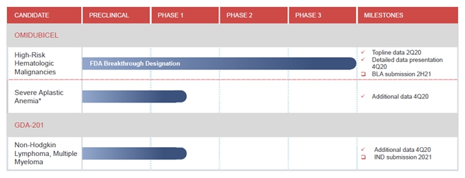 our expectations regarding timing of application for and receipt of regulatory approvals for omidubicel, GDA- 201 or any of our other potential product candidates;