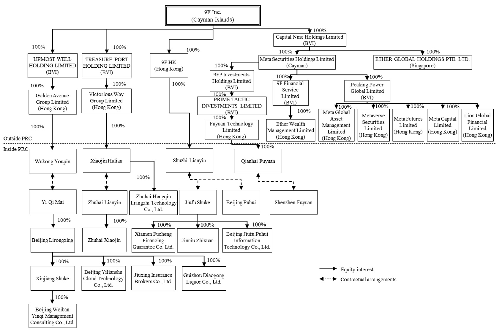 “9F,” “us,” “our company,” “our” and “we” are to (i) 9F Inc. and its subsidiaries in the context of describing our offerings of wealth management services (including internet securities service, fund sales and insurance brokerage service) outside China, and (ii) 9F Inc., its subsidiaries, the VIEs and their subsidiaries in China in the context of describing the general nature of our operations and our consolidated financial information;