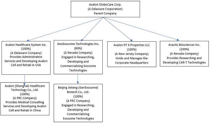 On February 7, 2017, we formed Avalon RT 9 Properties, LLC, a New Jersey limited liability company, and on January 23, 2017, we incorporated Avalon (BVI) Ltd, a British Virgin Islands company (dormant, to be dissolved). In July 2017, we formed GenExosome Technologies Inc., a Nevada corporation, or GenExosome. On October 25, 2017, we acquired 60% of GenExosome. Dr. Yu Zhou, MD, PHD holds 40% of GenExosome. On October 25, 2017, GenExosome acquired 100% of Beijing Jieteng (GenExosome) Biotech Co. Ltd., a corporation incorporated in the People’s Republic of China, or Beijing GenExosome.