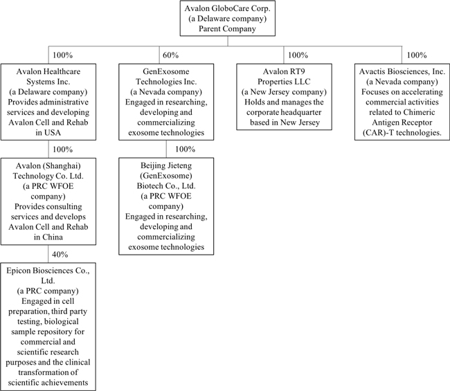 We own 100% of the capital stock of Avalon Healthcare Systems, Inc., a Delaware corporation, or AHS, which we acquired on October 19, 2016. AHS was incorporated on May 18, 2015 under the laws of the State of Delaware. In addition, we own through AHS 100% of the capital stock of Avalon (Shanghai) Healthcare Technology Co., Ltd., or Avalon Shanghai, which is a wholly foreign-owned enterprise, or WOFE, organized under the laws of the People’s Republic of China, or PRC or China. Avalon Shanghai was incorporated on April 29, 2016 and is engaged in medical related consulting services for customers. On January 23, 2017, we incorporated Avalon (BVI) Ltd, a British Virgin Islands company (dormant and in process of being dissolved). On February 7, 2017, we formed Avalon RT 9 Properties, LLC, a New Jersey limited liability company. In July 2017, we formed Genexosome Technologies Inc., a Nevada corporation, or Genexosome. On October 25, 2017, we and Genexosome entered into a Securities Purchase Agreement pursuant to which we acquired 600 shares of Genexosome in consideration of $1,326,087 in cash and 500,000 shares of our common stock. On October 25, 2017, Genexosome entered into and closed a Stock Purchase Agreement with Beijing Jieteng (Genexosome) Biotech Co. Ltd., a corporation incorporated in the People’s Republic of China, or Beijing Genexosome, and Yu Zhou, MD, PhD, the sole shareholder of Beijing Genexosome, pursuant to which Genexosome acquired all of the issued and outstanding securities of Beijing Genexosome in consideration of a cash payment in the amount of $450,000. On October 25, 2017, Genexosome entered into and closed an Asset Purchase Agreement with Dr. Zhou, pursuant to which we acquired all assets, including all intellectual property and the exosome separation system, held by Dr. Zhou pertaining to the business of researching, developing and commercializing exosome technologies in consideration of $876,087 in cash, 500,000 shares of our common stock and 400 shares of common stock of Genexosome. As a result of the above transactions, we hold 60% of Genexosome and Dr. Zhou holds 40% of Genexosome.