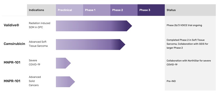 ● our ability to raise sufficient funds in the next 12 months in order for us to complete the Phase 3 portion of our Validive Phase 2b/3 clinical trial and if required, complete a smaller second confirmatory Phase 3 clinical trial, to support further development of camsirubicin beyond Phase 2 clinical trial, to support further development of potential radio-immuno-therapeutics to treat severe COVID-19 (patients with SARS-CoV-2 infection), to support additional development of MNPR-101 and related compounds and generally to support our current and any future product candidates through completion of trials, approval processes and, if applicable, commercialization;