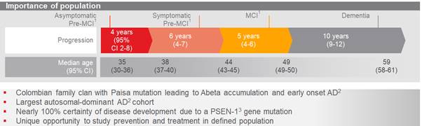 Crenezumab continues to be studied in a preventive trial of cognitively healthy individuals in Colombia with an autosomal dominant mutation who are at risk of developing familial AD (fAD), under the Alzheimer’s Prevention Initiative (API), which began in 2013. This study will determine if treating people carrying this mutation with crenezumab prior to the onset of AD symptoms will slow or prevent the decline of cognitive and functional abilities. This study is in collaboration with the Banner Institute and is funded by the National Institute on Aging.
